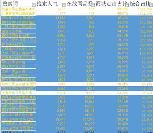 案例的宝贝是一款古风连衣裙,那么古风就是这款宝贝的核心属性。其他的词也应该是围绕着这个核心权重词去做延伸的,一旦换成另外的词来替换“古风”那么很显然买家点击了宝贝也不会购买,原有的流量也全部失去了!