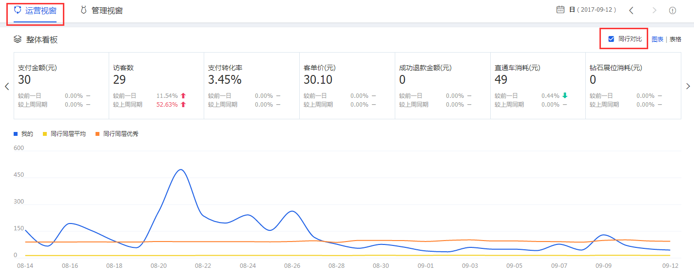而这个时候就需要去生意参谋—流量模板—流量趋势—查看最近30天的数据情况,你首先需要看一下的数据,在最近是否出现下滑的趋势,如果说有下滑的趋势。那么就你打开首页,向下拉找到运营视窗—整体看板,勾选同行比。